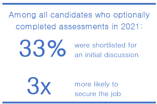 For some roles they’re optional during your initial application. But all hiring processes will involve an assessment at some stage, so optionally completing it can give you a serious head start on the competition.